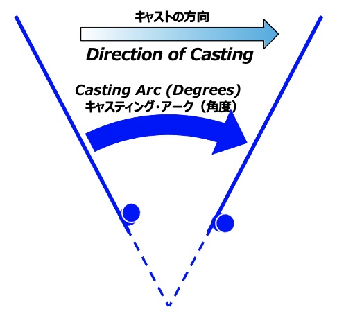 射出軌道=トラジェクトリーはターゲットまでの距離、及び風向きによって変動する。近距離を狙う場合、及び向かい風の場合は、高いバックキャストの後、ターゲットに対して鋭角に水面方向を狙う。距離が増すにつれて角度は水平に近づき、ロングキャスト、及び追い風の場合は、最適な射出角は水平線よりも高くなる。
