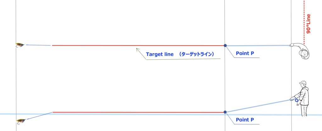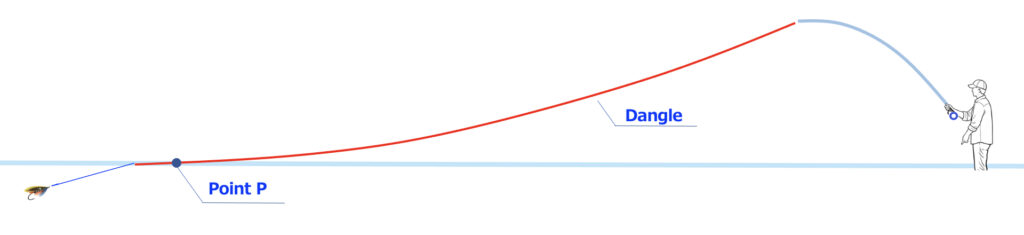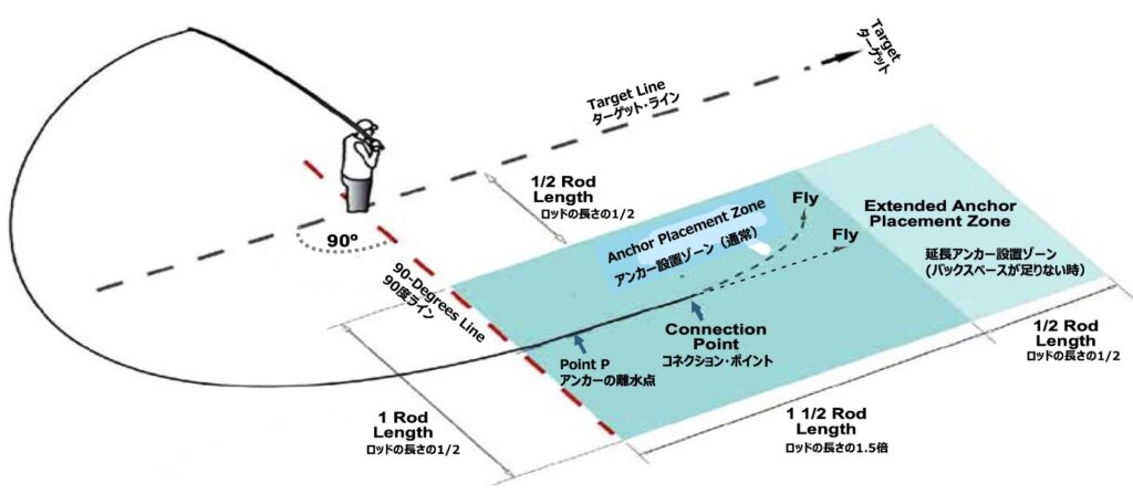 Point Pとは、フライラインが、ロッドティップから垂れ下がり最初に水に触れるポイント。Point P is the point where the fly line suspended from the rod tip first touches the water. Graphic by Hiro Masaki, MCI