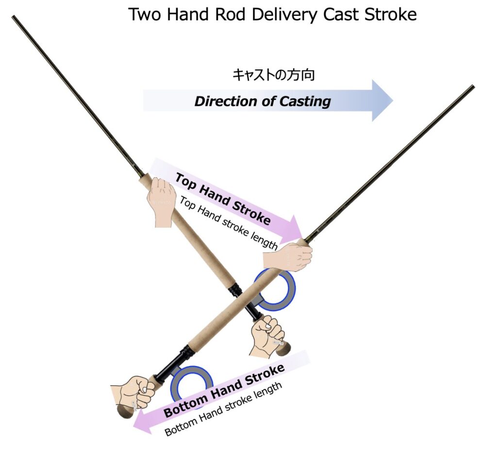 [Definition] When gripping a two-hand rod, the hand that grips the top part of the cork handle is called the “Top Hand”, and the hand that grips the bottom is called the “Bottom Hand”. Casting with the right hand on top is called a “Right-hand Up or Right-hand on top” cast, and vice versa is called a “Left-hand Up or left-hand on top” cast.