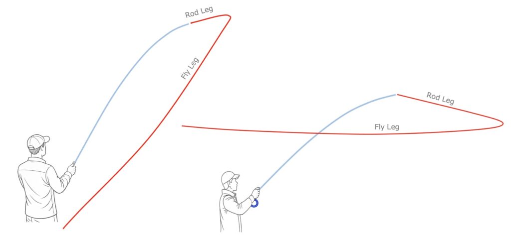 • Dangle position and condition: The state of the fly line hanging toward the target and how it is positioned in contact with the water.