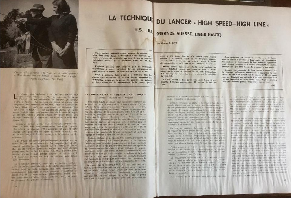 シャルル・リッツが、HS/HLの完結編を初めて文章にした、1964年2/3月号の『Plaisirs de la Pêche』の記事。この雑誌の編集者にはアーネストヘミングウェイ、アーノルドギングリッチなど錚々たるメンバーが名を連ねていた。Jacques Bordenave氏、Pezon et Michel-Cordel 提供。