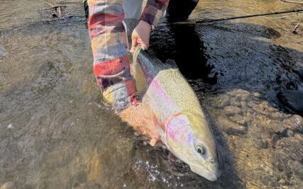 まずは70cm前半の強烈に強いアメマスがヒットした。コンディションのいい同サイズのスチールヘッドと比較して同等の強さ、持久力はアメマスが上。時間を経ずして、次に来たのがマグロのように太った写真の一本。体長は更にデカい。